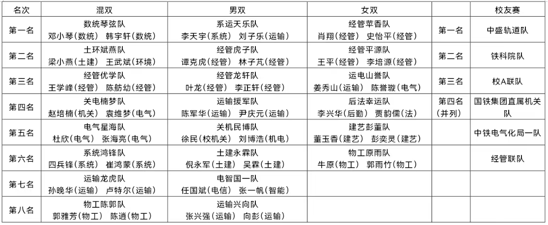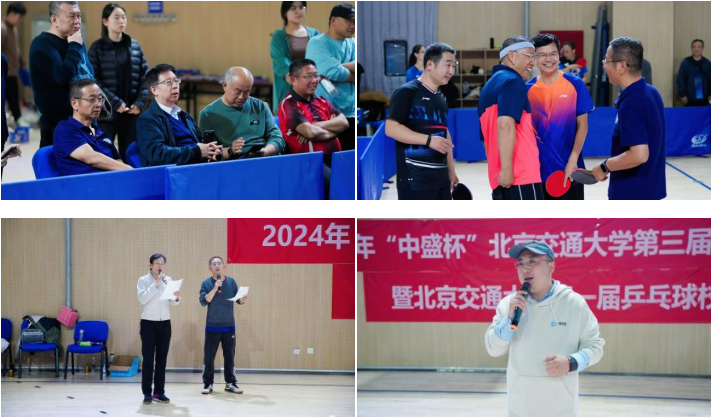 “中盛杯”首届校友邀请赛设置混合团体项目,4男1女组合团体,采用混双、男双、男单、女单、男单的五场三胜制比赛办法,吸引了国铁集团、铁科院、中铁电气化局、中盛轨道交通企业四家校外单位组成5支校友团队前来参赛,校内派出团队实力最强的4支单位院系代表队迎战。每支参赛队伍均配备乒乓实力超强选手,比赛进入刀光剑影、兵马厮杀的混战场面。