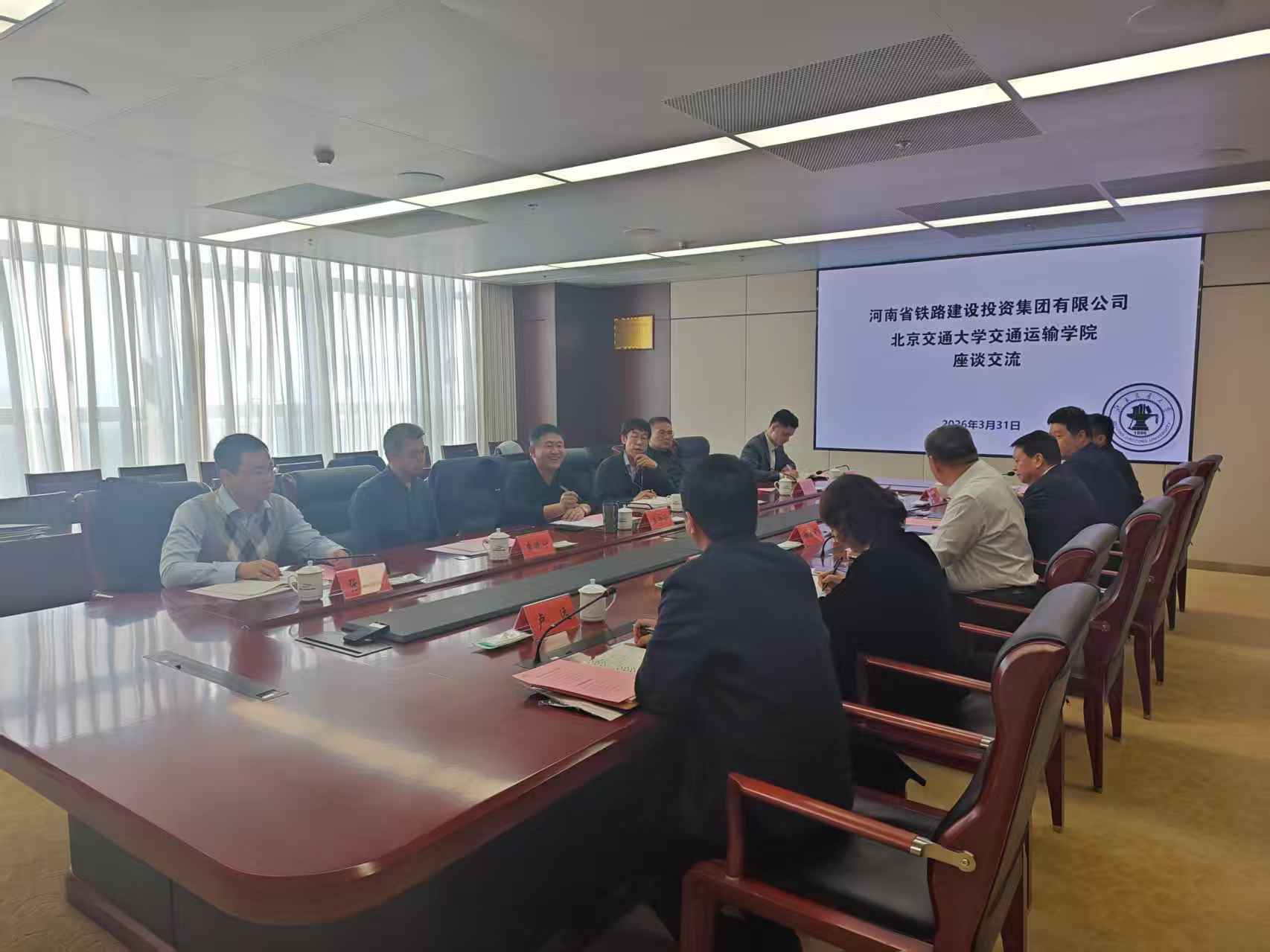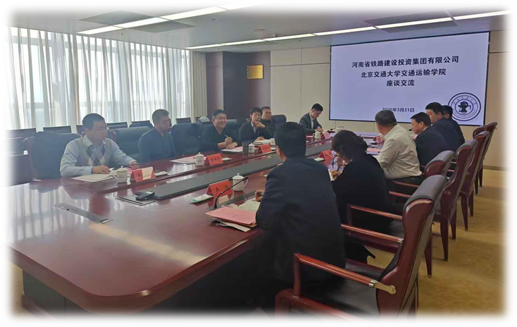 3月31日下午,河南铁建投集团党委书记、董事长柳建民在集团总部与免费av影片 院长孟令云一行举行座谈,双方围绕铁路物流高质量发展、高铁快运体系建设及校企合作等事宜进行深入交流。集团副总经理高洁及相关部门、单位负责人,免费av影片 教授张晓东、朱晓宁、魏玉光等专家参加座谈。